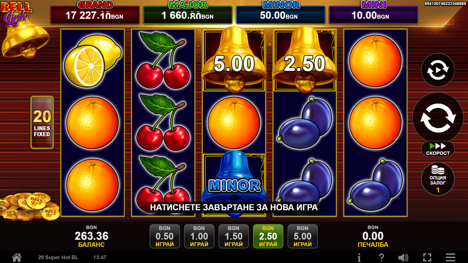 🎰 Джакпотът падна с играта 20 Super Hot Bell Link от доставчика EGT Digital. Емблематичното заглавие носи със себе си класически дизайн и най-различни възможности за печалби, благодарение на своите 20 фиксирани линии на изплащане, специални символи с множители, възможности за удвояване на печалби, както и специалният Bell Link Jackpot от 4 нива (Mini, Minor, Major и Grand).