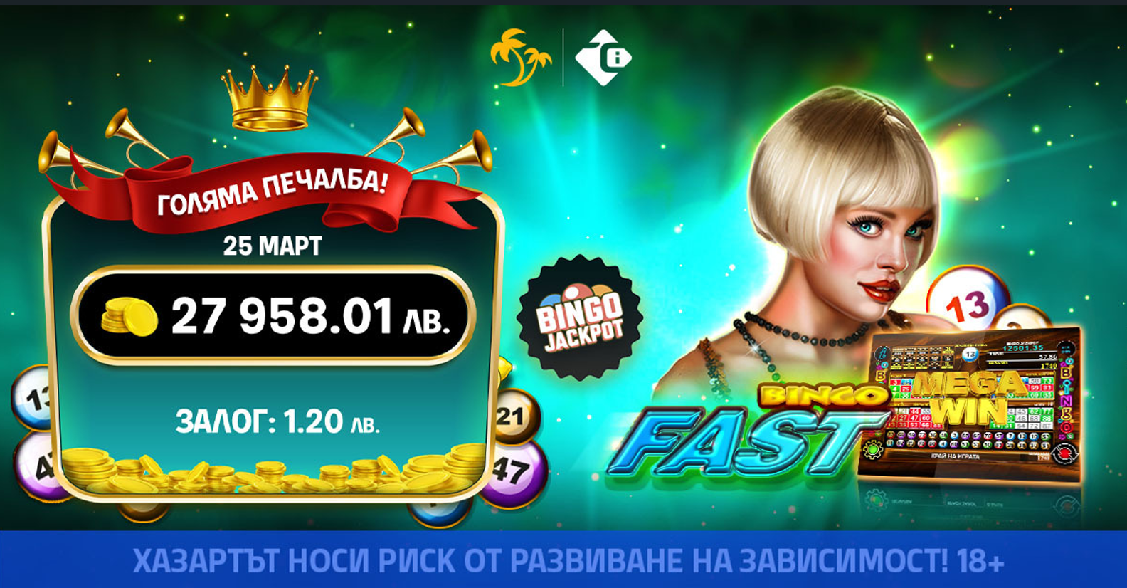 🔥 Bingo Fast, налична само при Палмата, доведе до страхотната сума. Тя е бърза, динамична и забавна Бинго игра, при която възможностите за печалба се крият зад всеки ъгъл! Bingo Fast дава възможност на играчите да се насладят на класическото Бинго изживяване с модерна визия и вълнуваща механика.