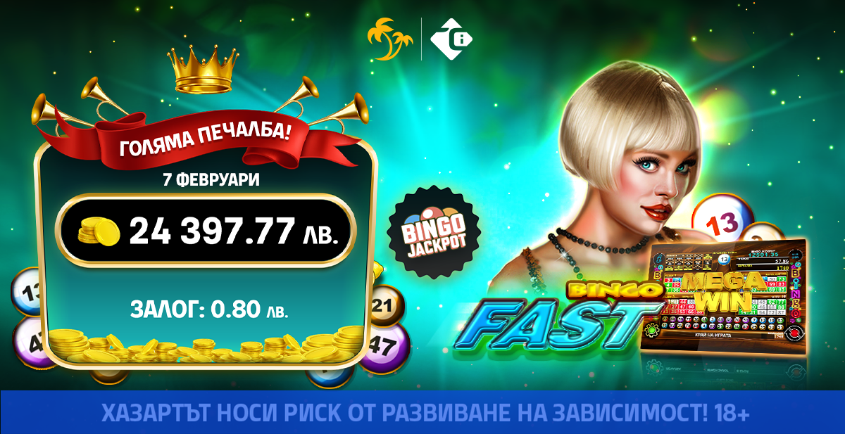 🍀 На 7 февруари (петък) късметът се усмихна и на играч в Bingo Fast, който грабна впечатляващия джакпот от 24,397 лв. при залог от едва 0.80 лв.!