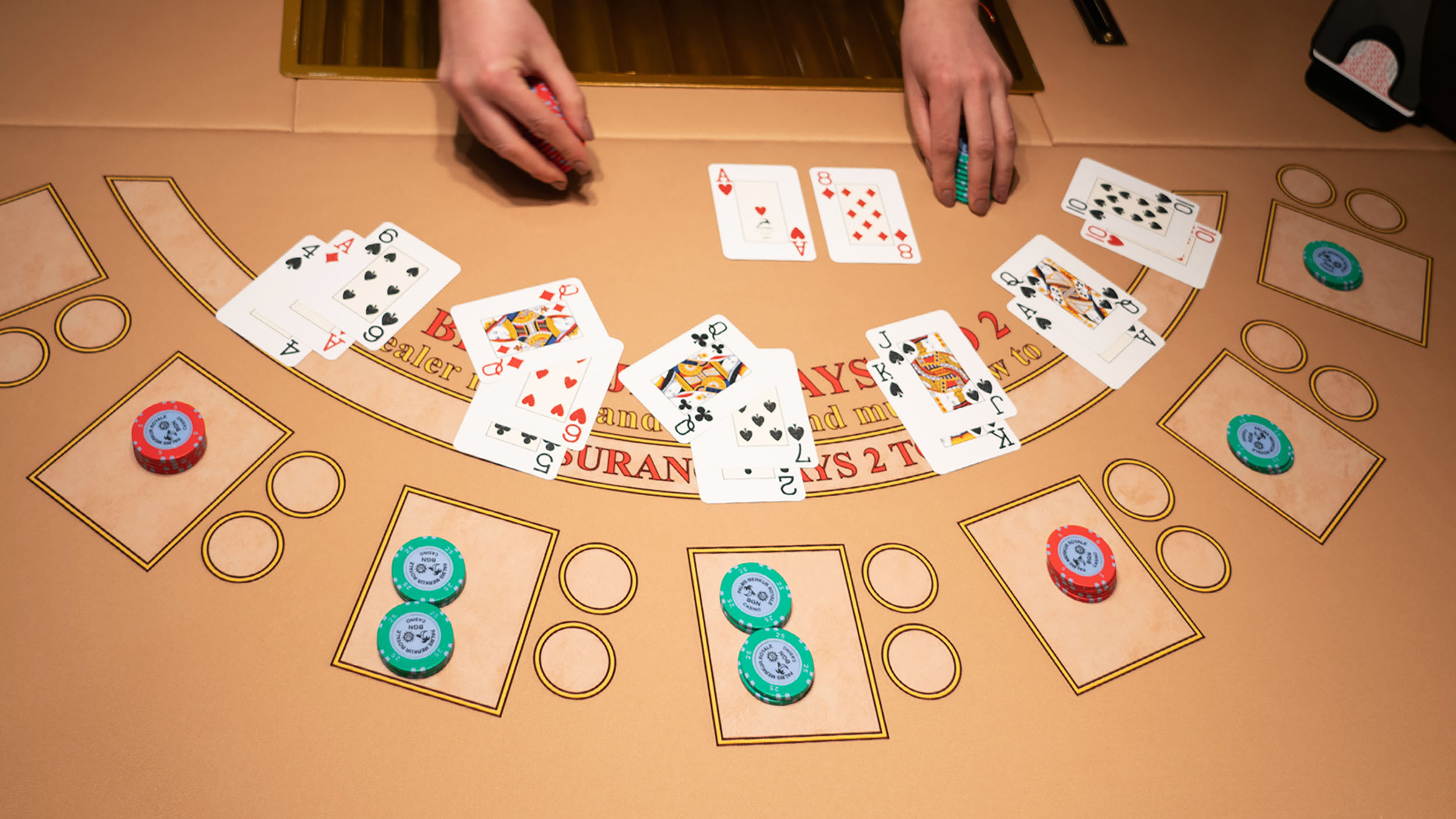 ♦️ При две еднакви карти може да се направи „сплит“ (разделяне в две ръце), а „дабъл“ означава удвояване на залога срещу само още една допълнителна карта. В някои варианти е разрешена и опцията „сърендър“ — отказ от ръката срещу възстановяване на половината залог.