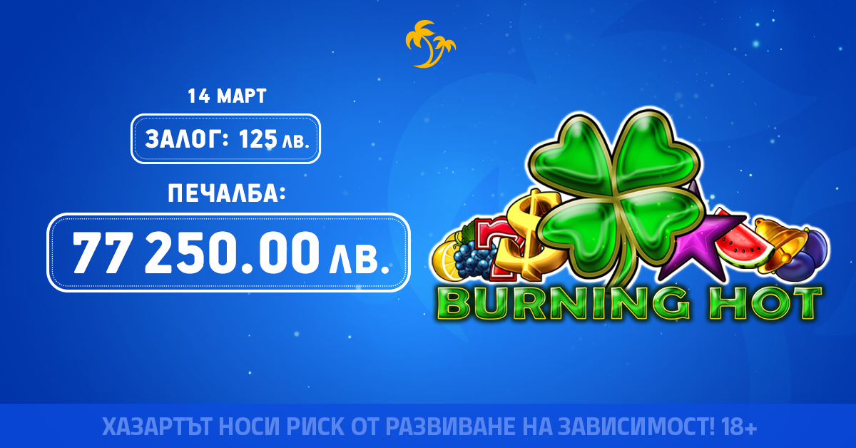 🌴 На 14 март играч в онлайн казиното на Palms Bet успя да спечели сумата от 77 250 лв. след залог от 125 лв.! Голямата печалба дойде без намесата на джакпот!