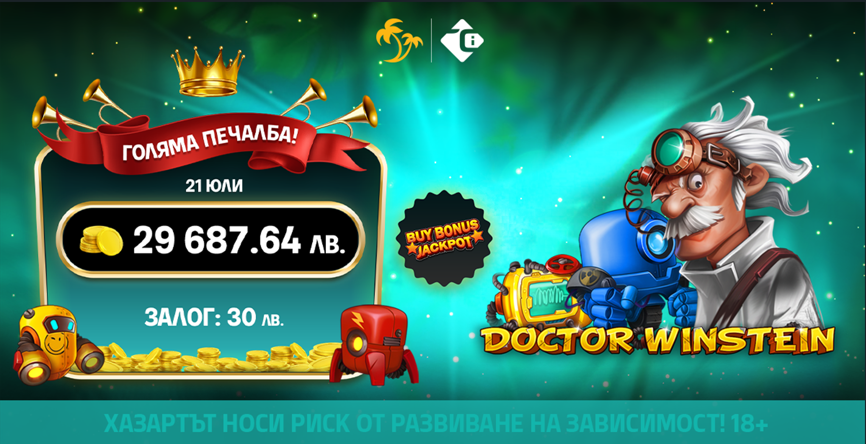🌴 На 21 юли в онлайн казиното на Palms Bet падна уникалният Buy Bonus Jackpot с играта Doctor Winstein Buy Bonus! Късметлията грабна сумата от 29 687.64 лв. след залог от 30 лв.! 💸