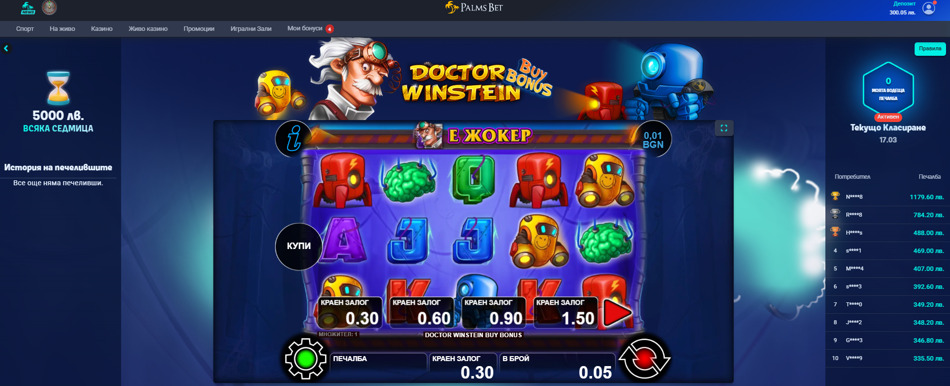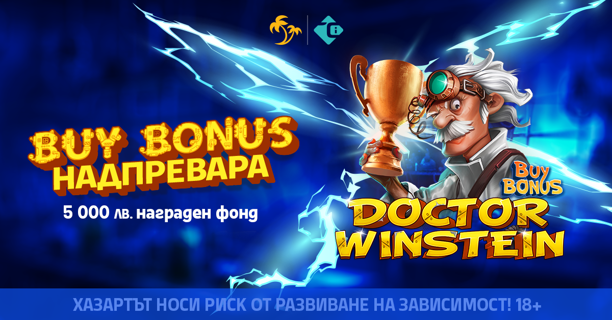 🔥 Играеш, печелиш и катериш класацията – всичко е толкова лесно! Присъедини се към седмичните надпревари на Doctor Winstein с Palms Bet и имаш шанс да спечелиш част от наградния фонд от 5000 лв.! 💸
