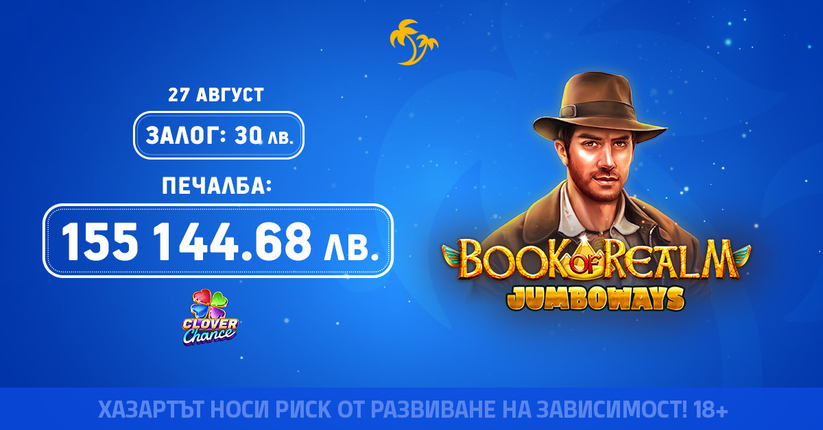 🌴 На 27 август играч в онлайн казиното на Palms Bet спечели впечатляващите 155 144.68 лв., грабвайки ниво Grand на Clover Chance Jackpot! Всичко това се случи със залог от 30 лв.! 🤑