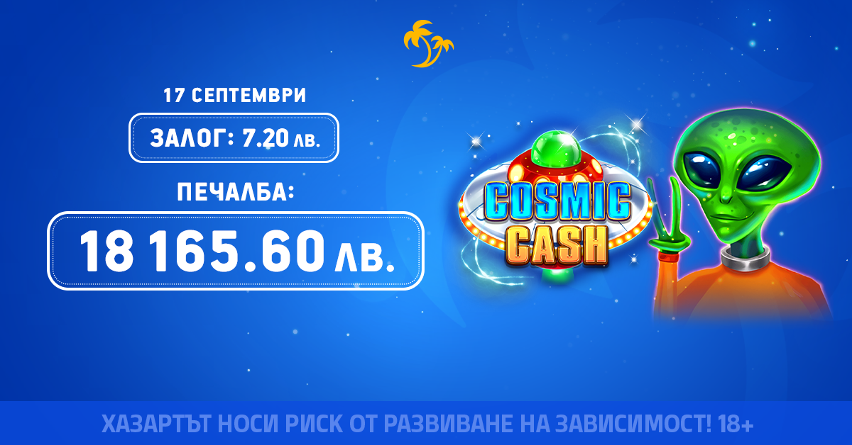 📢 На 17 септември онлайн казиното на Palms Bet отново стана сцена на впечатляващите печалби! Един от нашите играчи постигна невероятен успех на играта Cosmic Cash от Pragmatic Play.