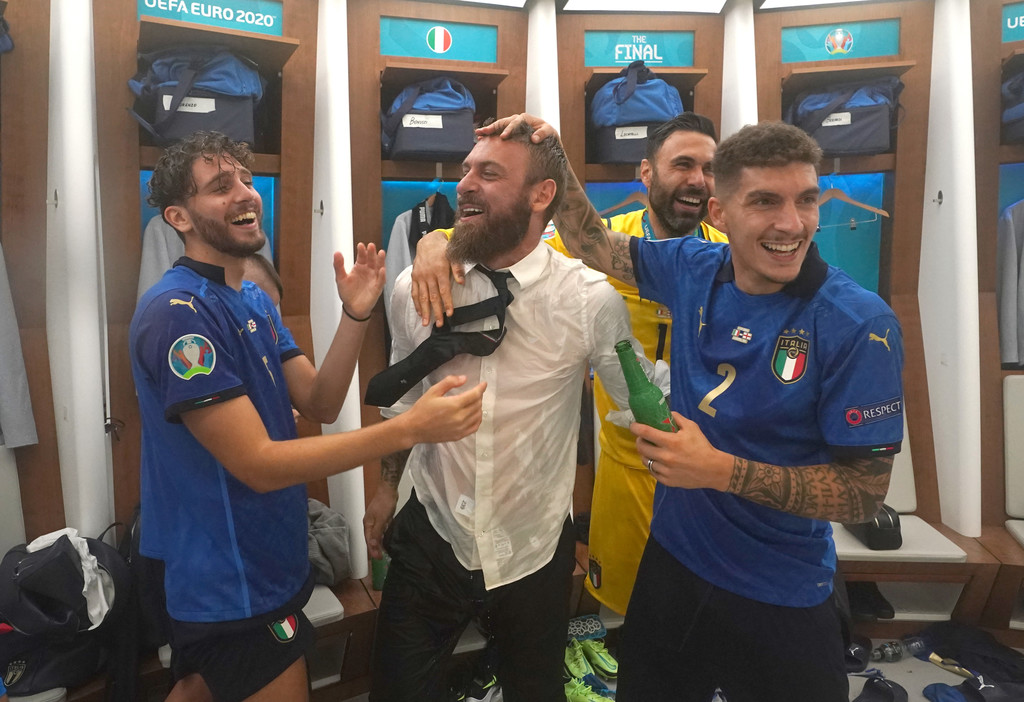 За радост на всички присъстващи, Де Роси се плъзна по няколко маси, подредени плътно една до друга, в средата на съблекалнята, след като Чиро Имобиле и останалите я поляха обилно с бира.