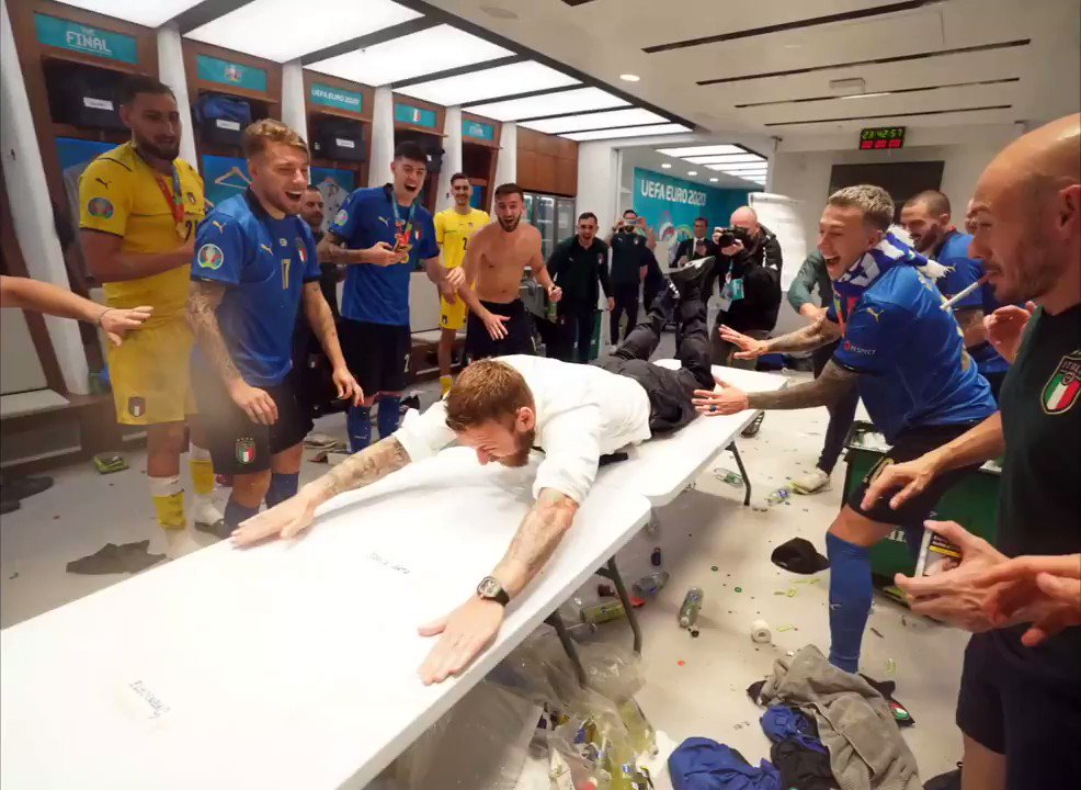 За радост на всички присъстващи, Де Роси се плъзна по няколко маси, подредени плътно една до друга, в средата на съблекалнята, след като Чиро Имобиле и останалите я поляха обилно с бира.
