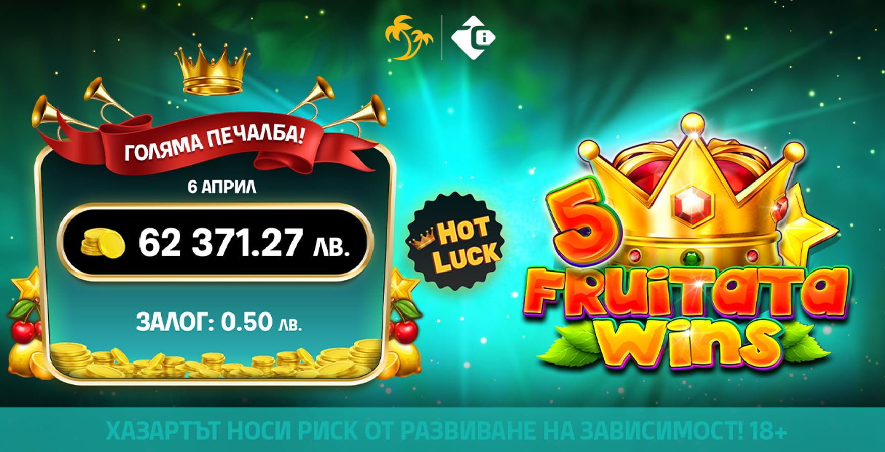 🌴 На 6 април играч в онлайн казиното на Palms Bet успя да грабне топ сумата от 62 371.27 лв. след залог от едва 0.50 лв.! Печалбата стана факт след падането на специалния Hot Luck Jackpot от CT Interactive! 💸