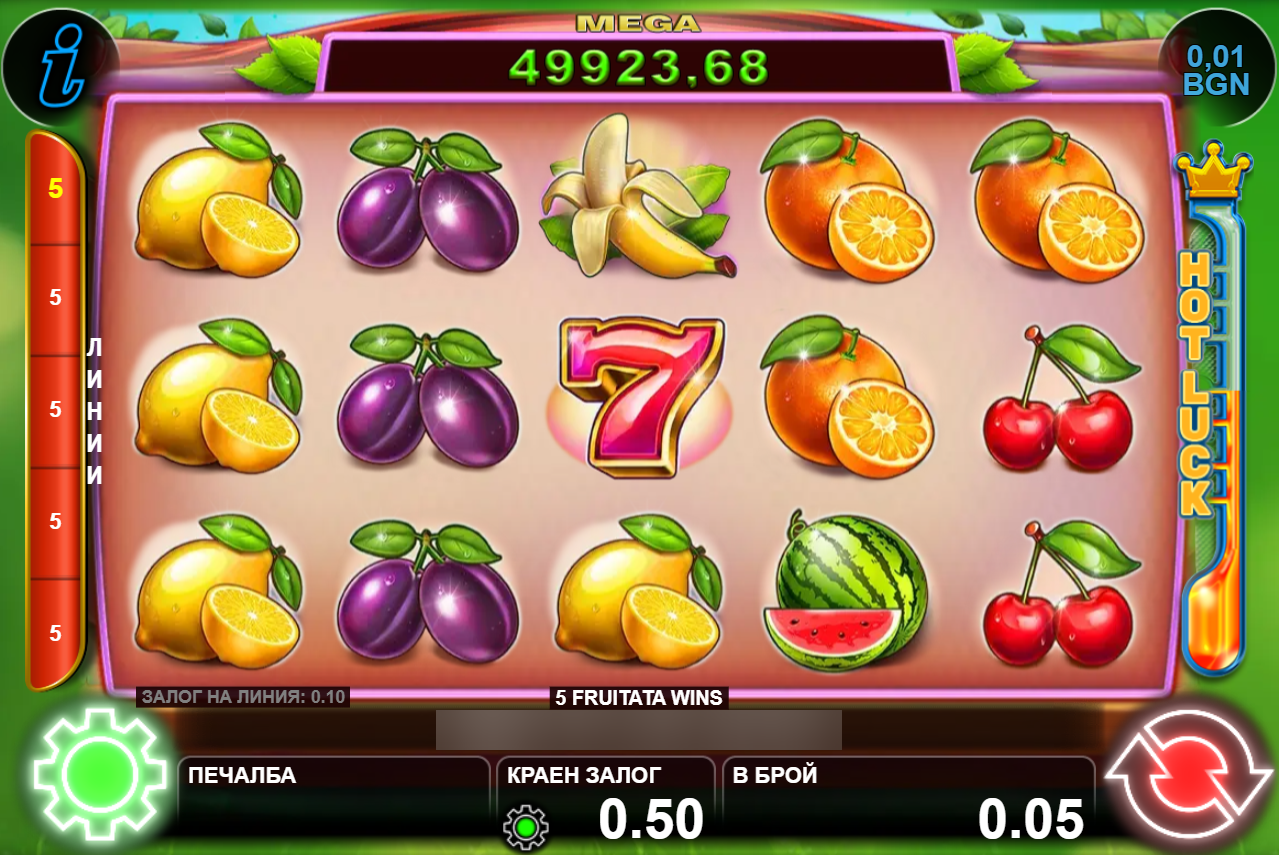 🎰 Играта, която доведе до печелившото завъртане, е добре познатата 5 Fruitata Wins! Популярното заглавие от CT Interactive предлага на играчите едно истински класическо слот преживяване със своите 5 линии на изплащане и страхотен дизайн, включващ плодове, корони и седмици – любими символи на любителите на слот забавленията! А с един жокер символ и цели два скатера, възможностите за печалба се крият зад всяко завъртане!