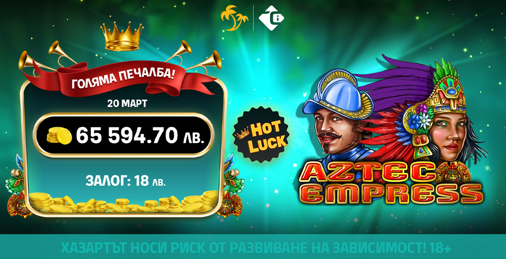 🌴 На 20 март в онлайн казиното на Palms Bet падна Hot Luck Jackpot на стойност 65 594.70 лв. след залог от 18 лв.! 💸