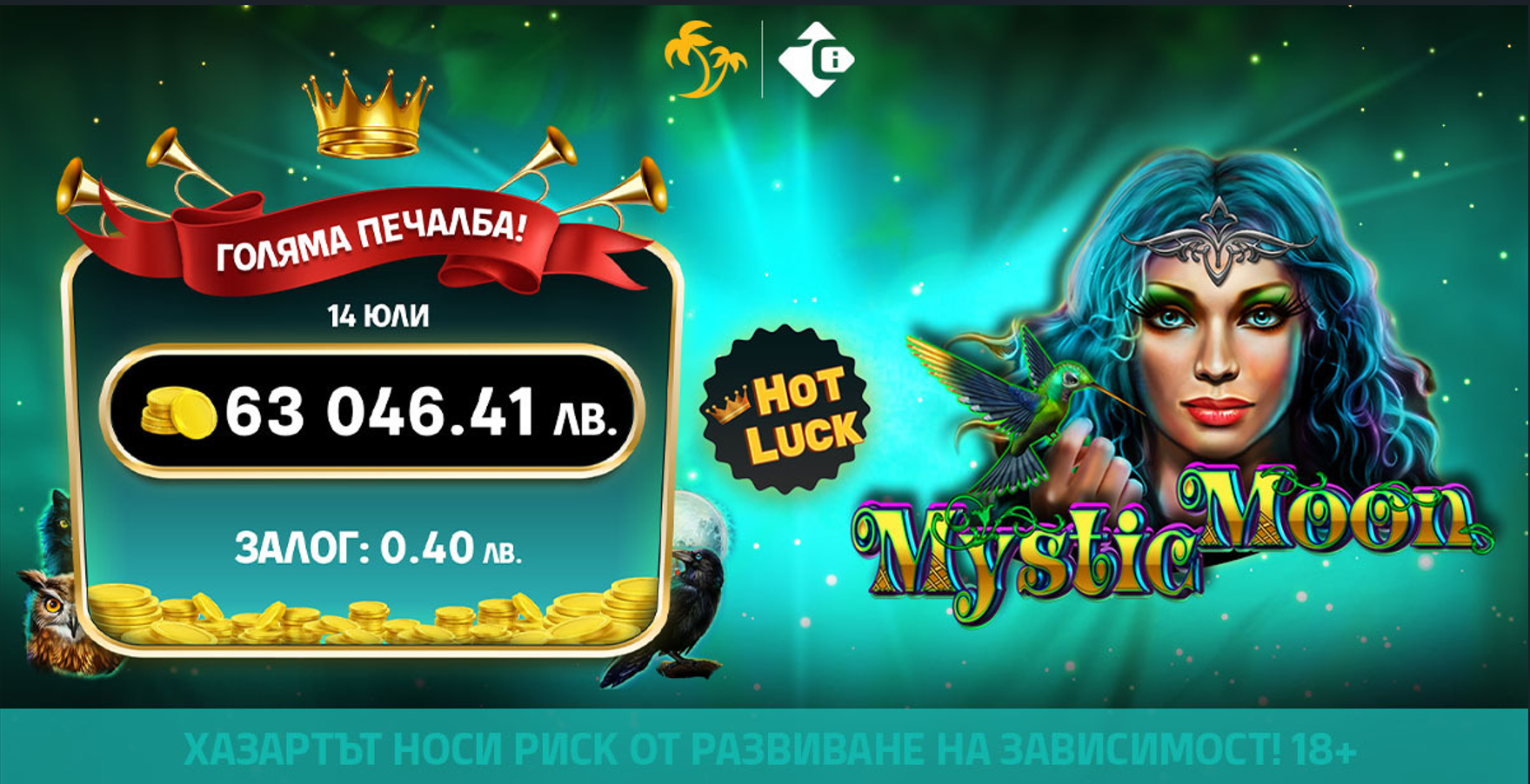 🌴 На 14 юли в онлайн казиното на Palms Bet падна поредният Hot Luck Jackpot на CT Interactive! Щастливецът грабна впечатляващата сума от 63 046.41 лв. със скромен залог от само 0.40 лв.! 🤑