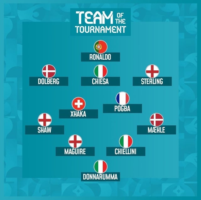 Нападатели – Каспер Долберг (Дания), Федерико Киеза (Италия), Рахийм Стърлинг (Англия) – Кристиано Роналдо (Португалия)