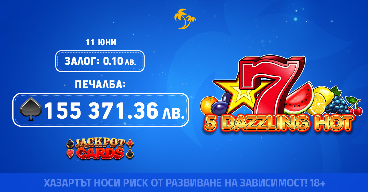♠️ На 11 юни късметът отново се усмихна на играч в онлайн казиното на Palms Bet, който грабна невероятната печалба от 155 371.36 лв., като улучи Пиката от Jackpot Cards! А залогът? Само 0.10 лв.! 💥
