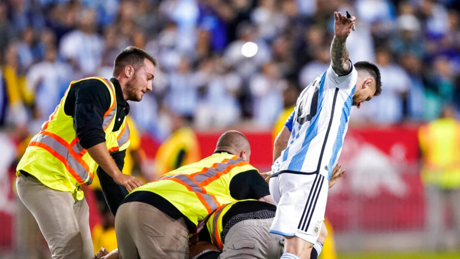 Този фен беше само един от тримата, които нахлуха на терена през целия мач, в който Аржентина доминираше. Малко след като се появи в игра Меси и отбеляза гол, друг фен нахлу на терена с желанието да получи автограф от футболиста. Меси нямаше против да подпише гърба му, но стюардите светкавично се нахвърлиха и върху двамата, като едва не повалиха и звездата на Аржентина и ПСЖ. За щастие бившата звезда на Барселона е невредим.