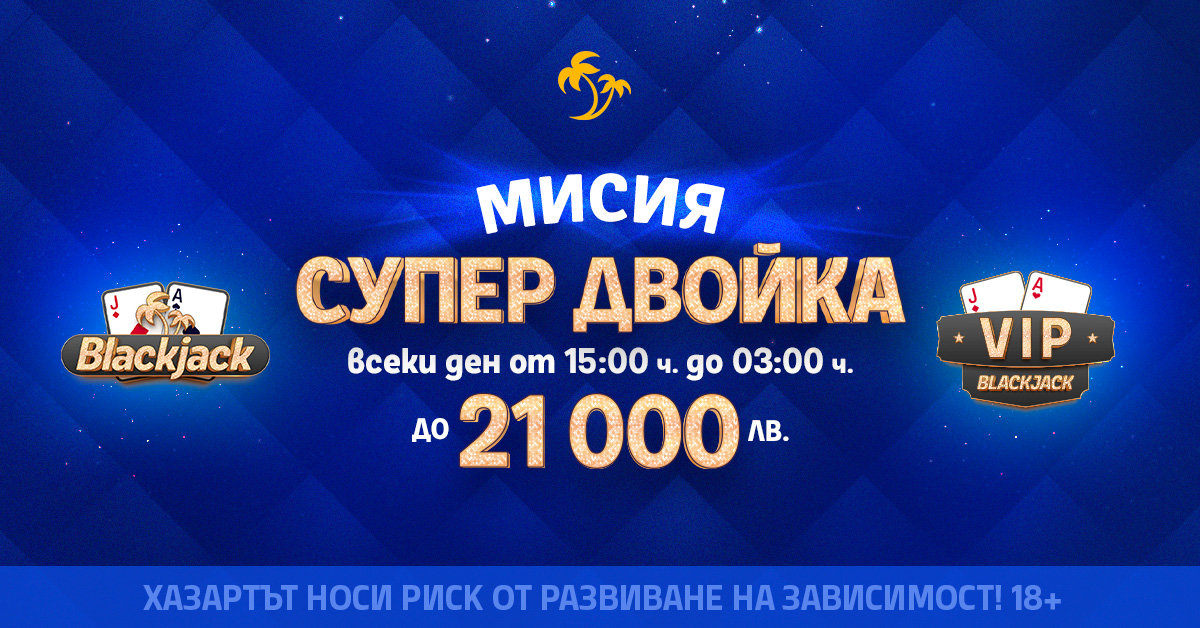 🎯 За да станеш част от мисията, е нужно да направиш минимален залог от 30 лв. на някоя от Blackjack масите на Palms Live. Ако с този залог получиш печеливша ръка „Blackjack“, получаваш уникални награди на следващия ден.