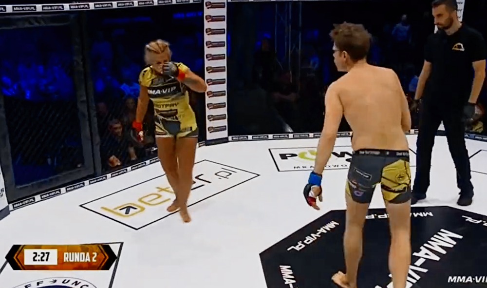 ММА двубоят завърши с победа за мъжа, който приклещи съперничката си и започна да я налага с юмруци в главата.