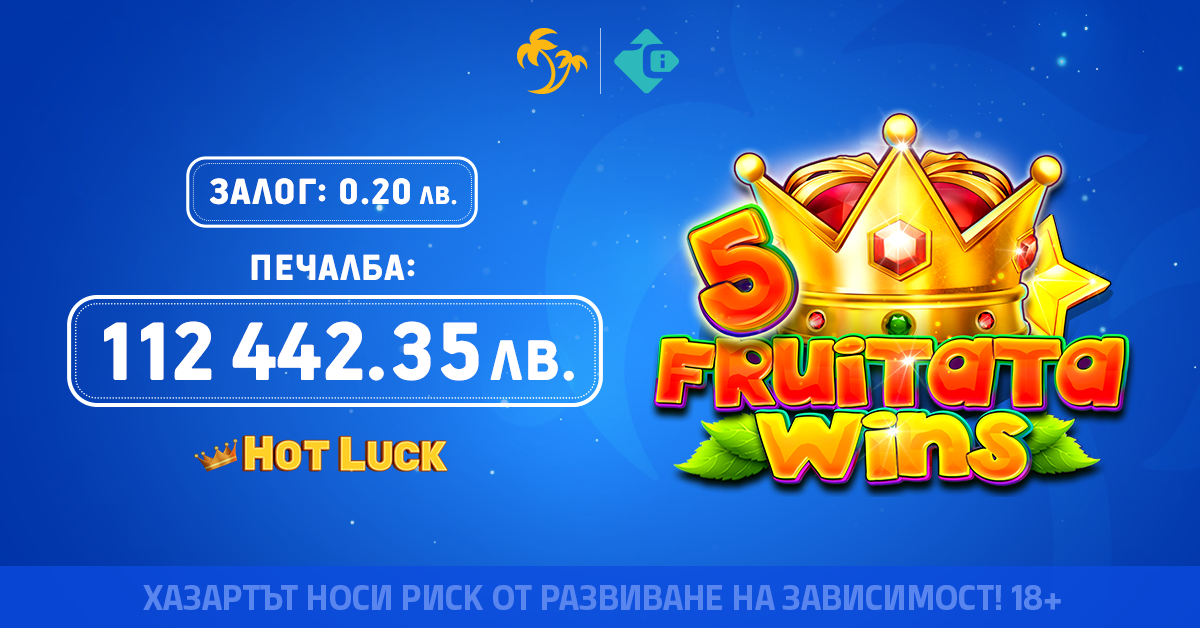 Hot Luck Jackpot падна в играта 5 Fruitata Wins от CT Interactive. След залог от само 0,20 лв. потребител спечели сумата от 112 442,35 лв.!
