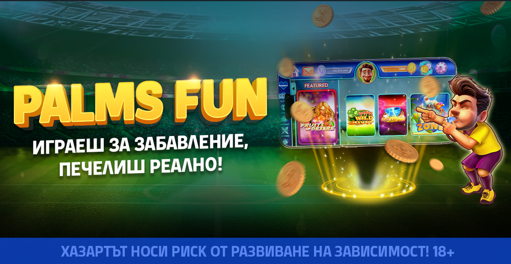 🌴 Както знаеш, Palms Bet стартира нова уникална игра с общ награден фонд от 5000 лв. на Palms Fun – мястото, където играеш за забавление, а шансовете за печалба са напълно реални! В нея всяка седмица топ 20 от класирането на Palms Fun печелят страхотни бонус суми и безплатни завъртания. 🎁