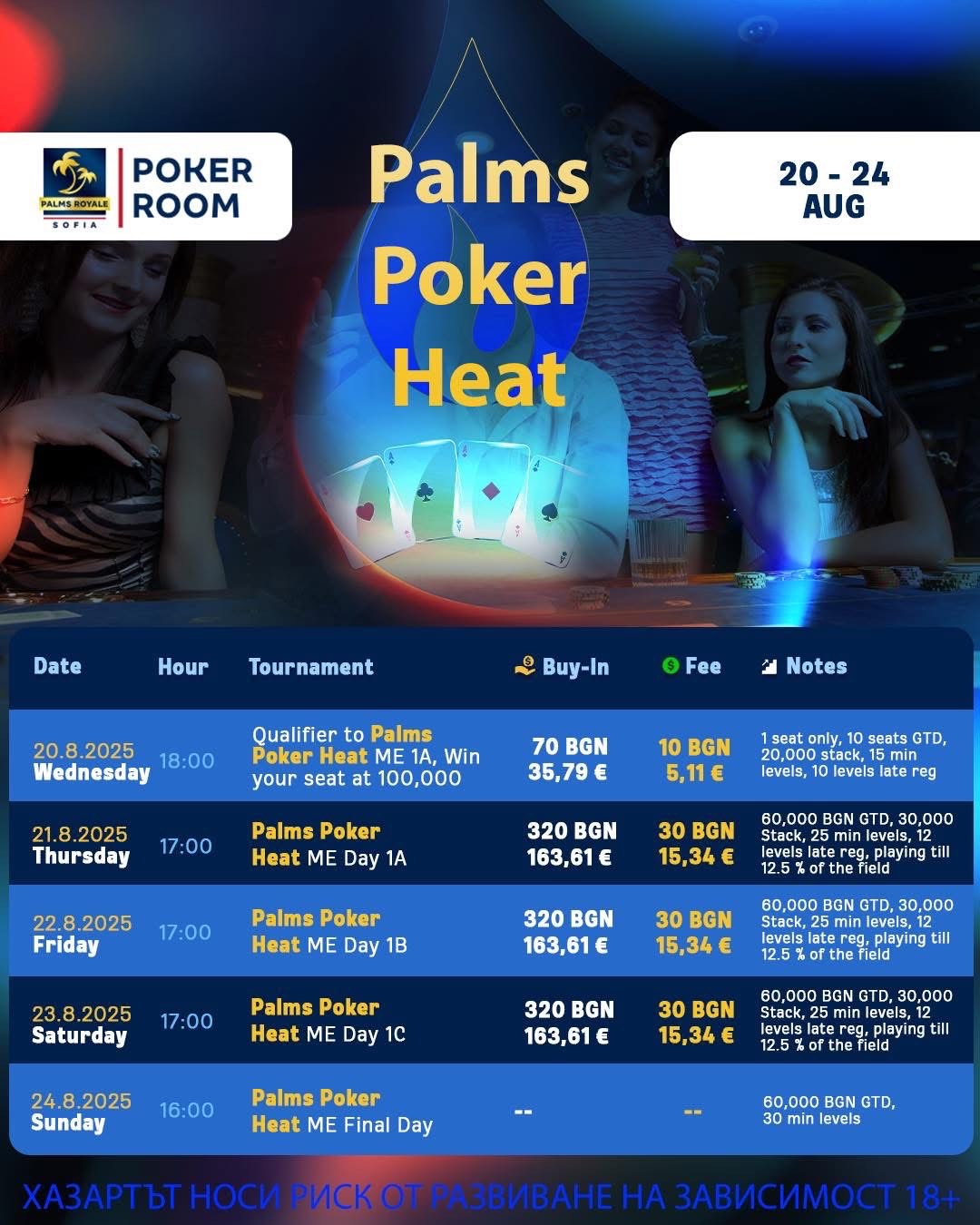 От 20 до 24 август в Palms Royale Sofia ще се проведе Palms Poker Heat – турнир с входна такса от 350 лв. и гарантиран награден фонд 60,000 лв.