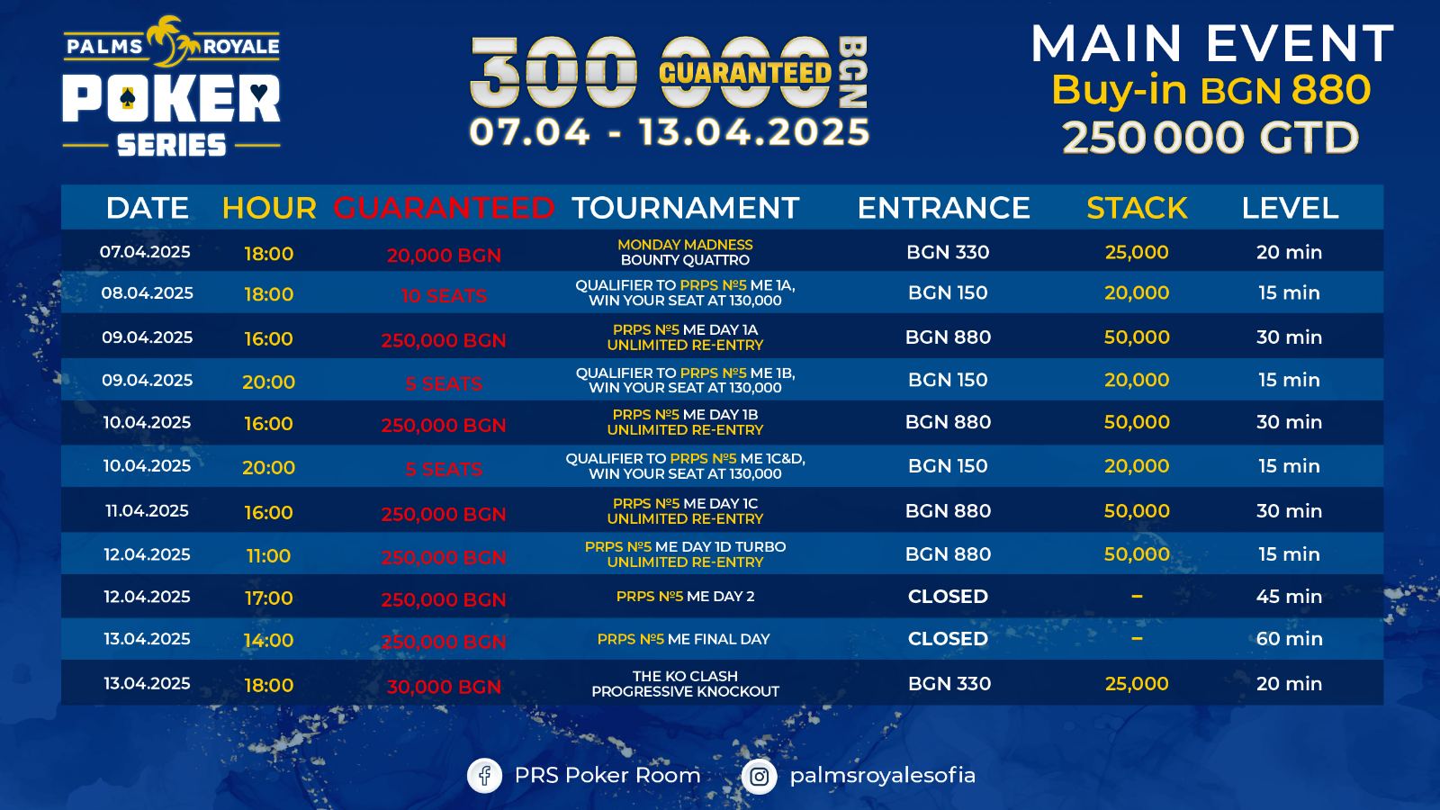 🚀 Основен акцент в програмата на Palms Royale Poker Series е главното събитие – турнир с входна такса от 880лв. и гарантиран награден фонд от 250,000лв.