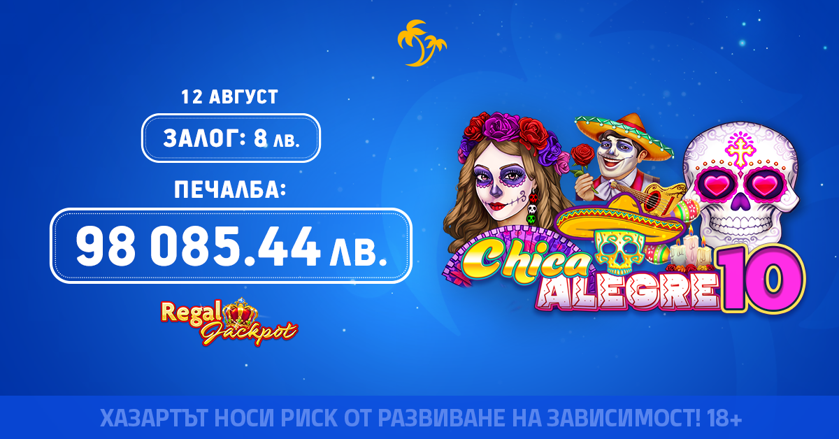🌴 На 12 август в онлайн казиното на Palms Bet падна поредната впечатляваща печалба! Regal Jackpot донесе на щастливеца невероятната сума от 98 085.44 лв. при залог от само 8 лв.! 💸
