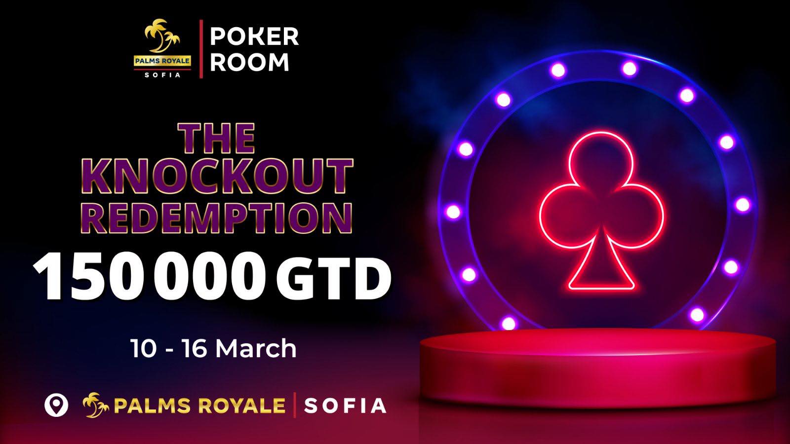 📢 От 10 до 16 март в покер залата на Palms Royale Sofia ще се проведе The Knockout Redemption: фестивал с три грандиозни покер турнира и общ гарантиран награден фонд от 150,000лв.