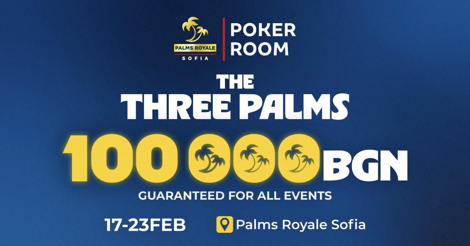От 17-ти до 23-ти февруари в покер залата на Palms Royale Sofia ще се проведе атрактивен покер фестивал – The Three Palms – с общ гарантиран награден фонд от 100,000лв.