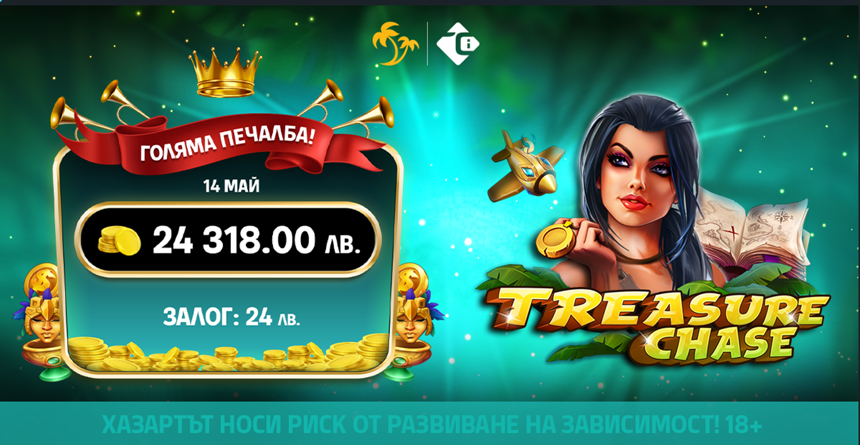 🎰 Печалбата дойде чрез Treasure Chase от CT Interactive – игра, която пренася играчите в свят на скрити съкровища, тайнствени артефакти и незабравими приключения! Със завладяваща графика, бонус функции и вълнуващ геймплей с каскадна механика, тази слот игра е създадена за истински търсачи на печалби. А както виждаш – съкровището може да се окаже много по-близо, отколкото очакваш!