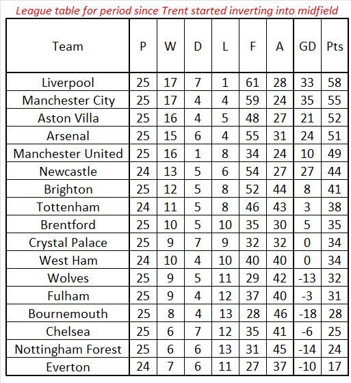 Класирането от момента, в който Арнолд влезе в средата на терена, говори без особени анализи. Ливърпул е спечелил най-много точки и е вкарал най-много голове за 25 кръга, в които десният бек е диригентът в играта на отбора.