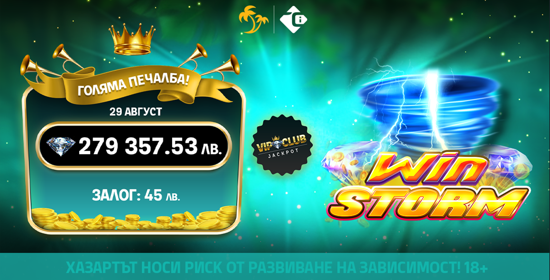 🌴 На 29 август в онлайн казиното на Palms Bet падна най-голямото ниво на VIP Club Jackpot! Щастливецът грабна внушителните 279 357.53 лв. при залог от 45 лв.! 💸