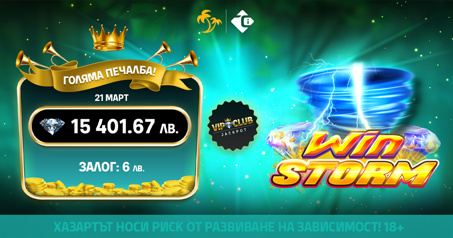 💸 На 21 март падна второто по големина ниво на уникалния VIP Club Jackpot на Palms Bet! Сумата от 15 401.67 лв. намери своя печеливш след залог от едва 6 лв.!