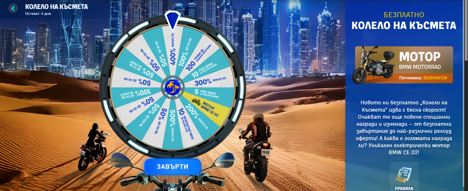 🌴 На 5 юни късметлия в онлайн казиното на Palms Bet спечели голямата награда от Безплатното Колело на Късмета – електрически мотор BMW CE 02!